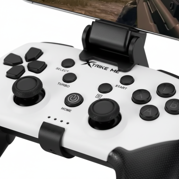 - Incluye un práctico soporte ajustable para smartphones, lo que lo convierte en la solución perfecta para gaming móvil, streaming o emuladores. Puedes colocar el teléfono directamente sobre el control para una experiencia tipo consola en cualquier lugar.